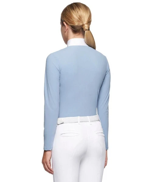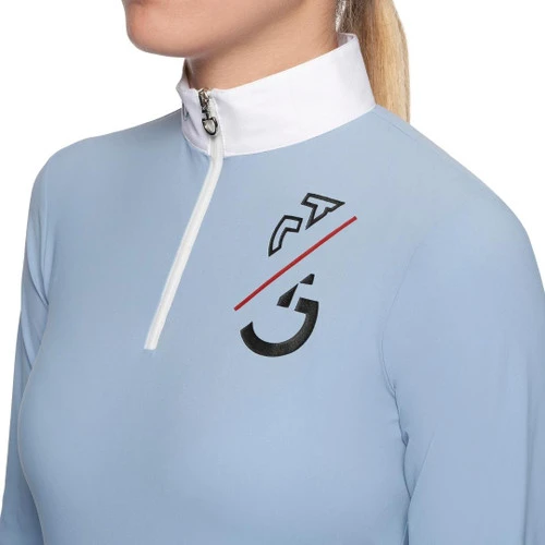 The beautiful light blue color makes the Cavalleria Toscana Girls Team Competition Zip Polo a style standout! The young rider’s long sleeve competition shirt has premium stretch tech fabric, a crisp white poplin show collar, and bold team red stripe logo accents for contemporary style.