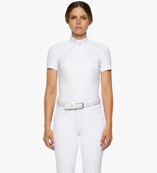 Cavalleria Toscana Sunbeam Competition Polo with short sleeves has unique piping to add a sophisticated and eye-catching style element. Ladies equestrian competition shirt is a quarter zip style with standing collar finished with a fabric cover for the zipper pull. The collar has a signature embroidered CT logo.