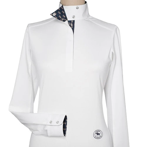 Essex Classics Girls Talent Yarn Show Shirt with Koala Bears print trim has traditional show ring style, modern comfort, and high tech features. The Essex pullover show shirt for girls has a quarter snap placket that is covered for a clean look under a hunt coat. The wrap collar on the Koala Bears show shirt snaps closed for showing then can be unsnapped to reveal the charming patterned lining. The Koala Bears children’s show shirt from Essex Classics has a navy collar and cuff print.