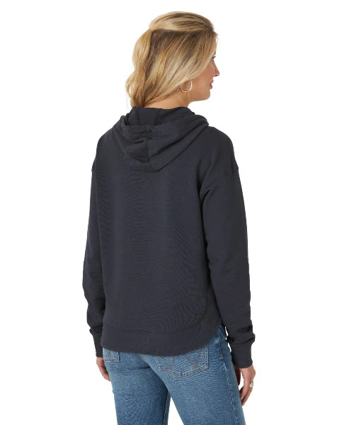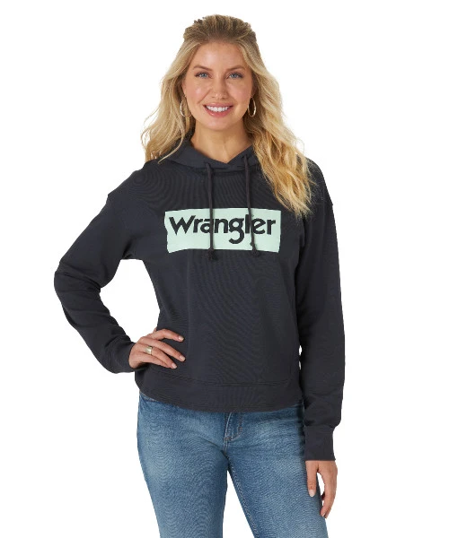 Wrangler Curved Hem Hoodie has little extras that make it stand out from the rest. Women’s drawstring hoodie has a curved high low hem and plain front with no pockets. A bold Wrangler cutout logo in cool mint green is a refreshing dash of color against the slate blue sweater. Cute, lightweight, and versatile, the Wrangler Curved Hem Hoodie is a fresh look at a low price.